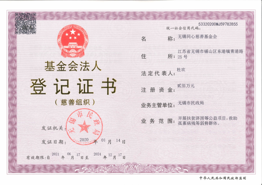 经无锡市民政局审批,基金会正式更名为“无锡同心慈善基金会”,基金会业务主体、法律关系不变,在进行中的公益项目不受影响。